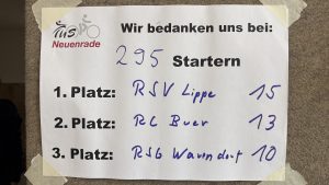 Vielen Dank an alle 295 Teilnehmenden, die sich heute den Herausforderungen in Neuenrade gestellt haben. Die Temperaturen waren o.k. Jedoch die Menge an Regen, der z.T. sehr starke Wind, der fluffige Schlamm und nicht zuletzt die Höhenmeter haben alles von euch gefordert. Vielen Dank für eure Teilnahme aus nah und fern, wie wissen es zu schätzen. Vielen Dank!